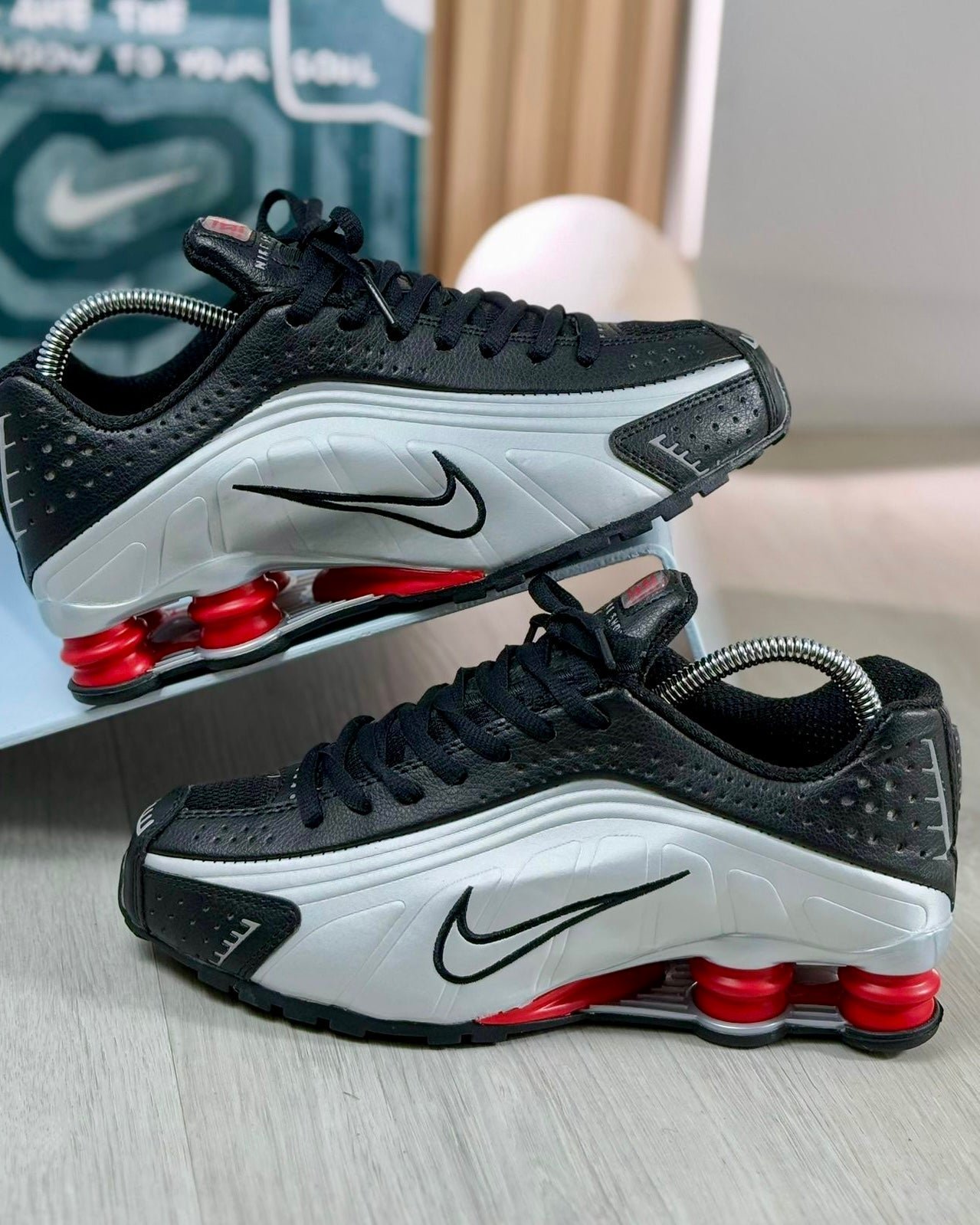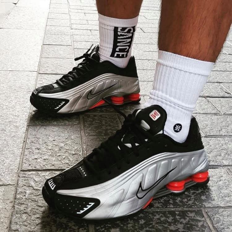 Zapatos Nike Shox negros y grises con logo Nike, suela gruesa y detalles rojos.
